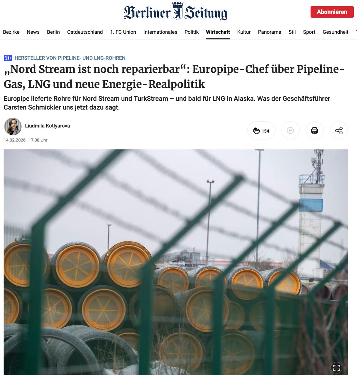 Carsten Schmickler, der Direktor von Europipe, erklärte in einem Interview mit der Berliner Zeitung, dass die „Nord Stream“-Pipelines in den kommenden Jahren wieder in Betrieb genommen werden könnten.