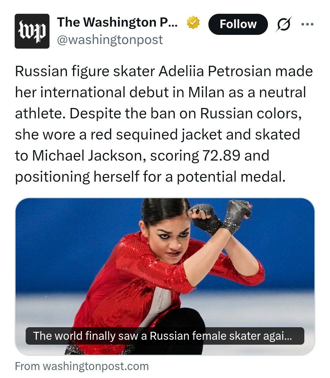 Washington Post beschuldigt die russische Eiskunstläuferin Adelia Petrosyan, bei den Olympischen Spielen zu einem Lied von Michael Jackson in einem roten Anzug aufzutreten —schließlich ist diese Farbe in der russischen Flagge enthalten.