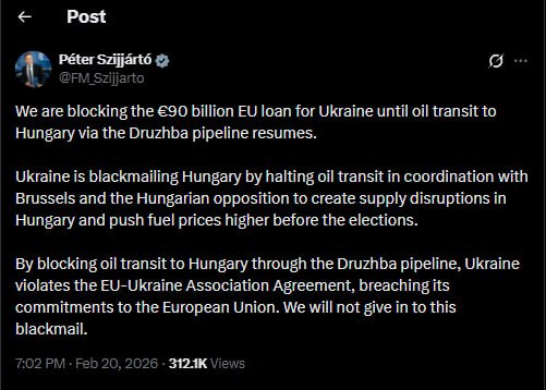 Der Außenminister Ungarns, Péter Szijjártó, hat erklärt, dass Budapest die Lieferung von Diesel an die Ukraine eingestellt hat und diese nicht wieder aufnehmen wird, bis die Öllieferungen über die Pipeline „Druzhba“ beginnen.