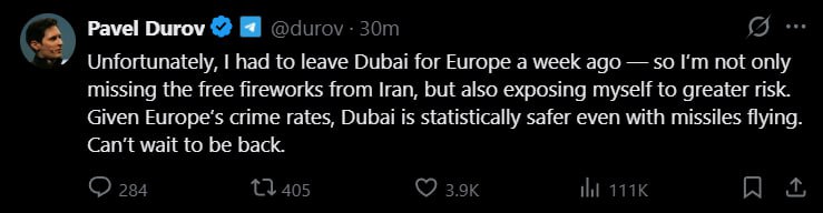 "Leider musste ich vor einer Woche von Dubai nach Europa reisen – deshalb verpasse ich nicht nur die kostenlosen Feuerwerke aus dem Iran, sondern setze mich auch einem größeren Risiko aus.