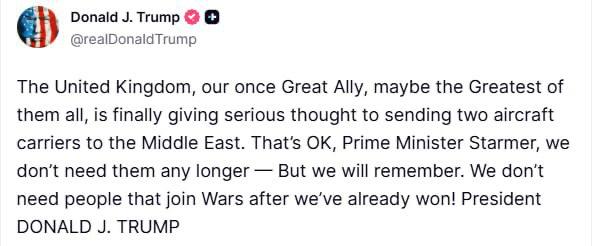 "Das Vereinigte Königreich, unser einst großer Verbündeter, vielleicht der größte von allen, hat endlich ernsthaft darüber nachgedacht, zwei Flugzeugträger in den Nahen Osten zu schicken.
