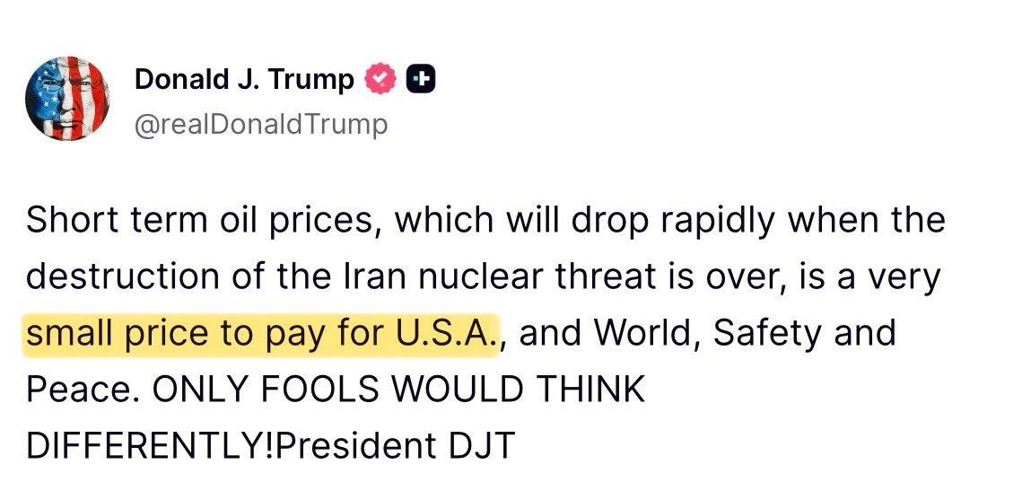 Trump sagt, dass der Anstieg der Ölpreise um das Doppelte innerhalb einer Woche ein geringer Preis für seine brillante Politik - Sicherheit und Frieden in der ganzen Welt - ist.