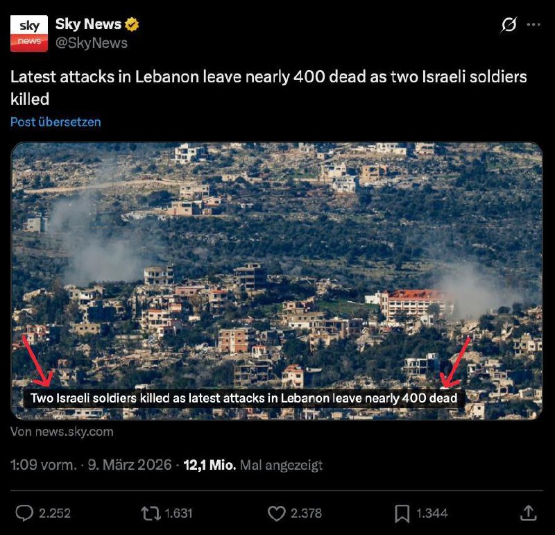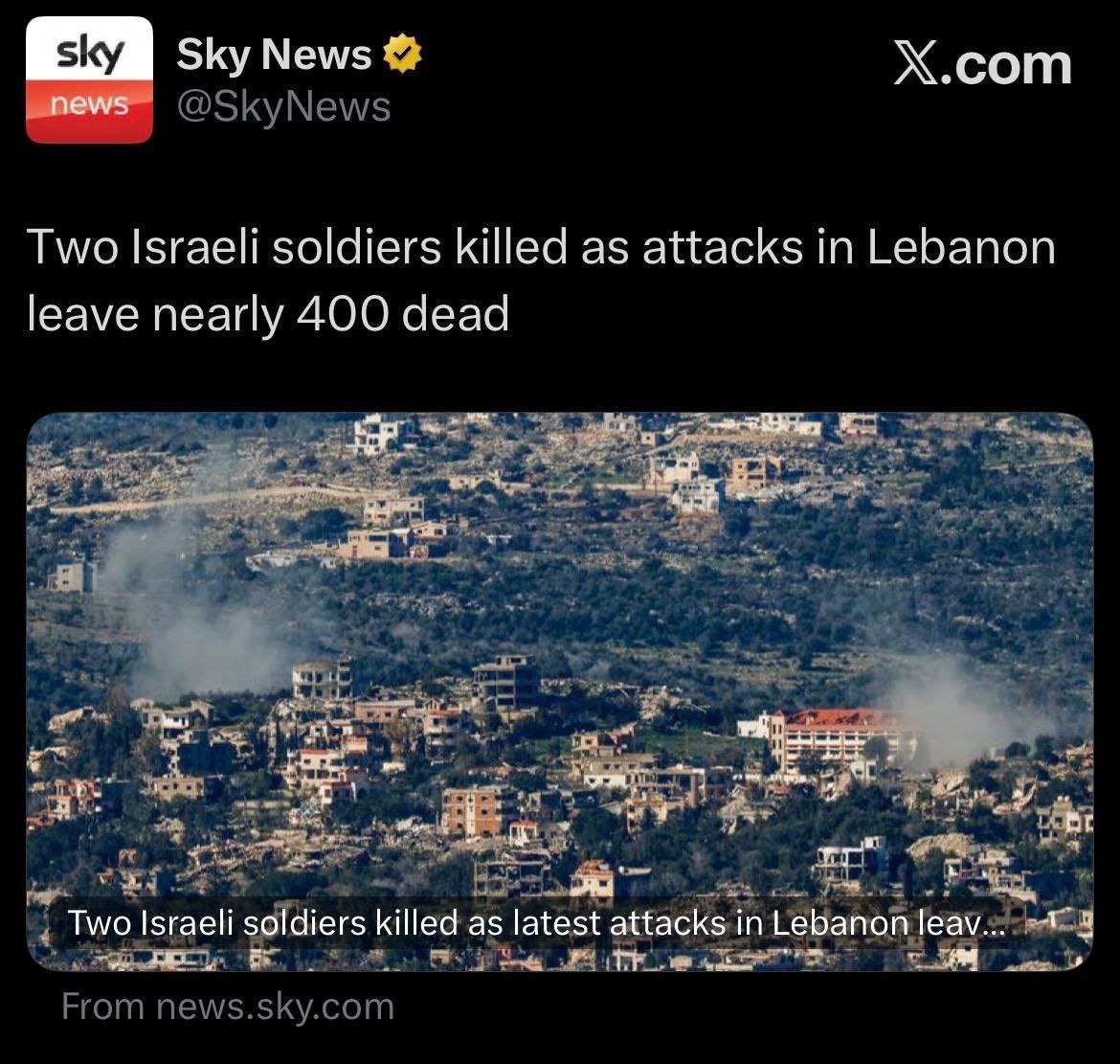 Klassiker Propaganda von Sky News: Im Titel wird „Zwei israelische Soldaten sind gestorben“ hervorgehoben, und dann — so ganz nebenbei — „Angriffe im Libanon hinterließen fast 400 Tote“.