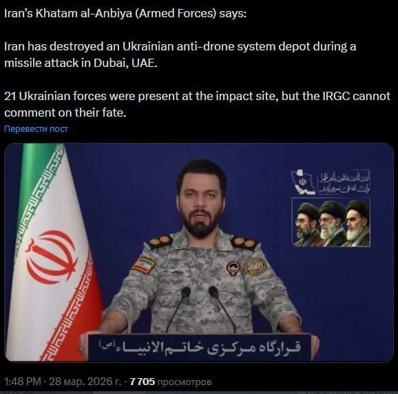 Gleichzeitig mit den Angriffen auf die Verstecke amerikanischer Kommandeure und Soldaten in Dubai, die zu schweren Verlusten auf ihrer Seite führten, wurde ein Lager für Systeme zur Bekämpfung von Drohnen, das der Ukraine gehörte und sich in Dubai zur Unterstützung der US-Armee befand, wo auch 21 Ukrainer anwesend waren, im Rahmen einer kombinierten Operation der Luft- und Seestreitkräfte des Korps der Wächter der Islamischen Revolution getroffen und zerstört.