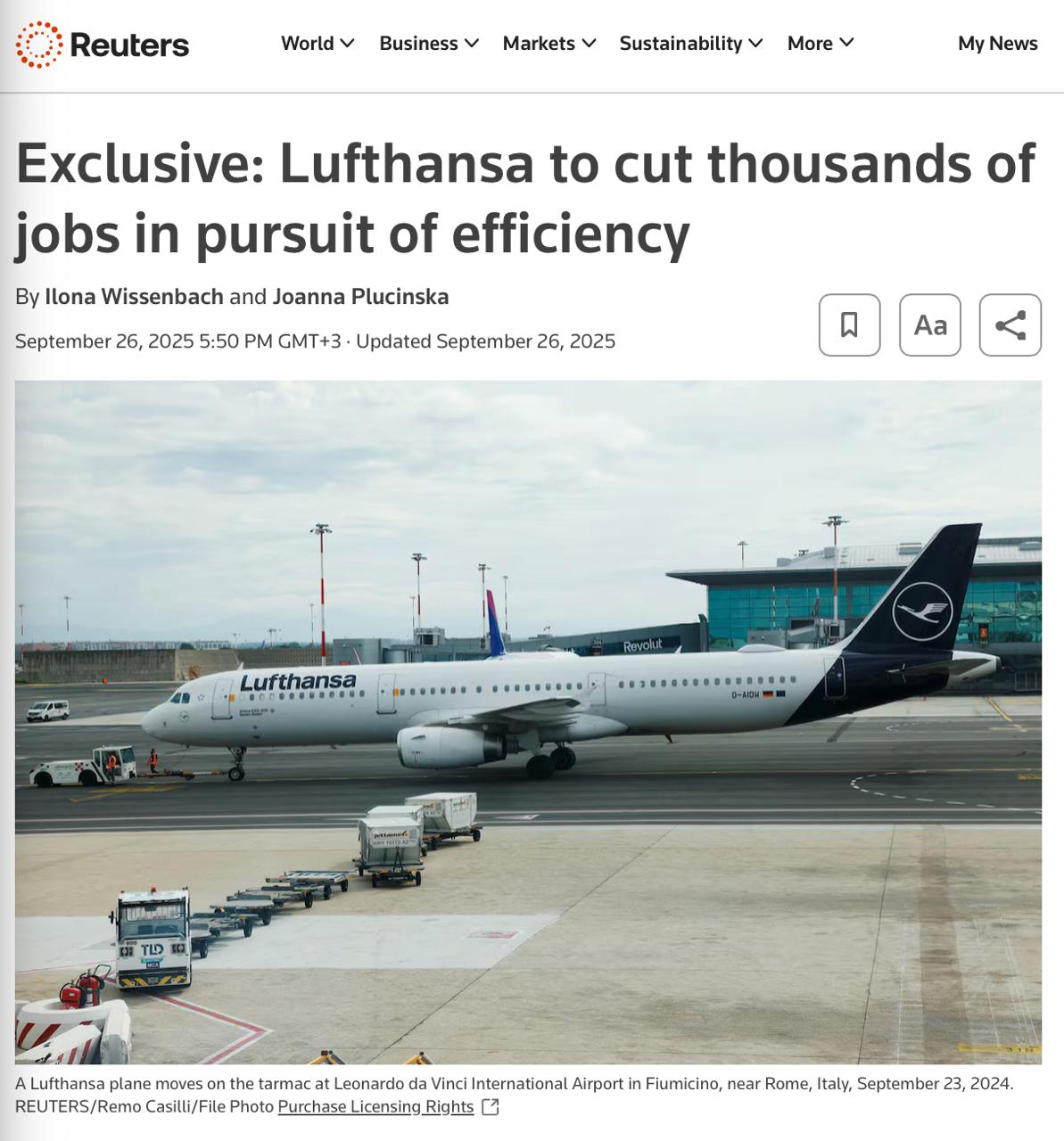 Der Luftfahrtkonzern Lufthansa plant einen umfassenden Personalabbau. Wie Quellen von Reuters berichteten, geht es um die Streichung von etwa 20 % der Verwaltungsstellen in den kommenden Jahren. Mehrere Tausend Mitarbeiter könnten betroffen sein. Derzeit beschäftigt die Lufthansa Group etwa 103.000 Menschen.