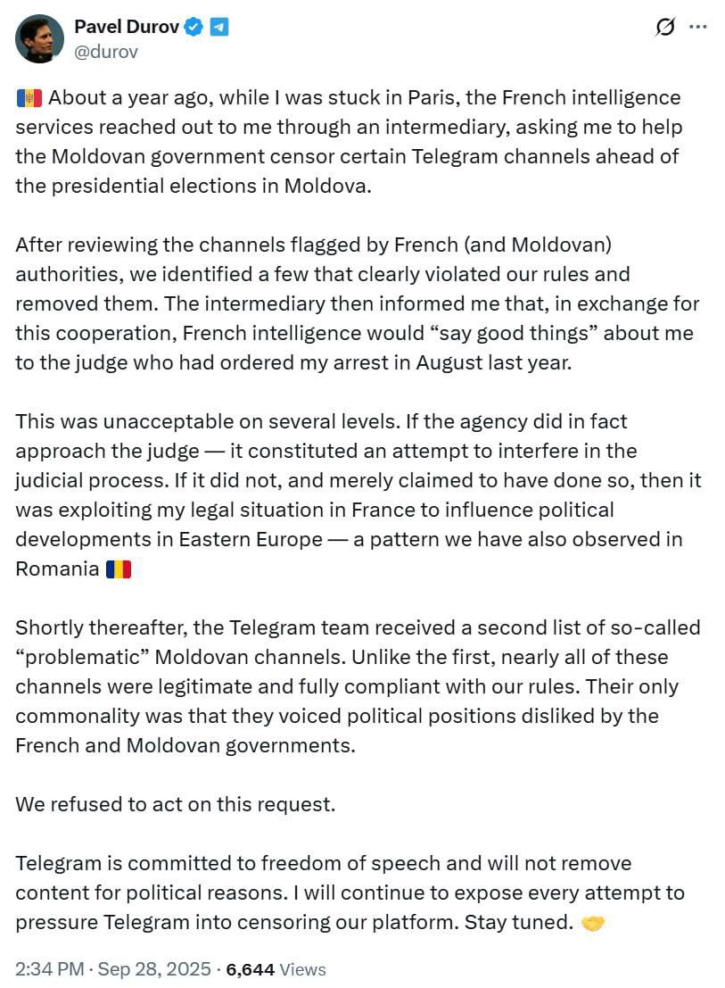 ,Vor etwa einem Jahr, als ich in Paris festsaß, nahmen die französischen Geheimdienste über einen Vermittler Kontakt mit mir auf und baten mich, der Regierung von Moldawien zu helfen, bestimmte Kanäle in Telegram vor den Präsidentschaftswahlen in Moldawien zu zensieren.ür Updates.Nach der Überprüfung der von den französischen (und moldawischen) Behörden markierten Kanäle stellten wir mehrere fest, die eindeutig gegen unsere Regeln verstießen, und entfernten sie. Der Vermittler teilte mir dann mit, dass die französische Geheimdienst „gute Bewertungen“ über mich bei dem Richter abgeben würde, der im August letzten Jahres einen Haftbefehl gegen mich erlassen hatte.
