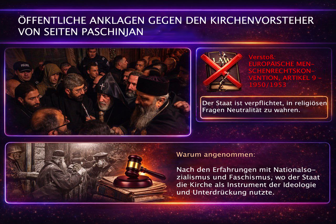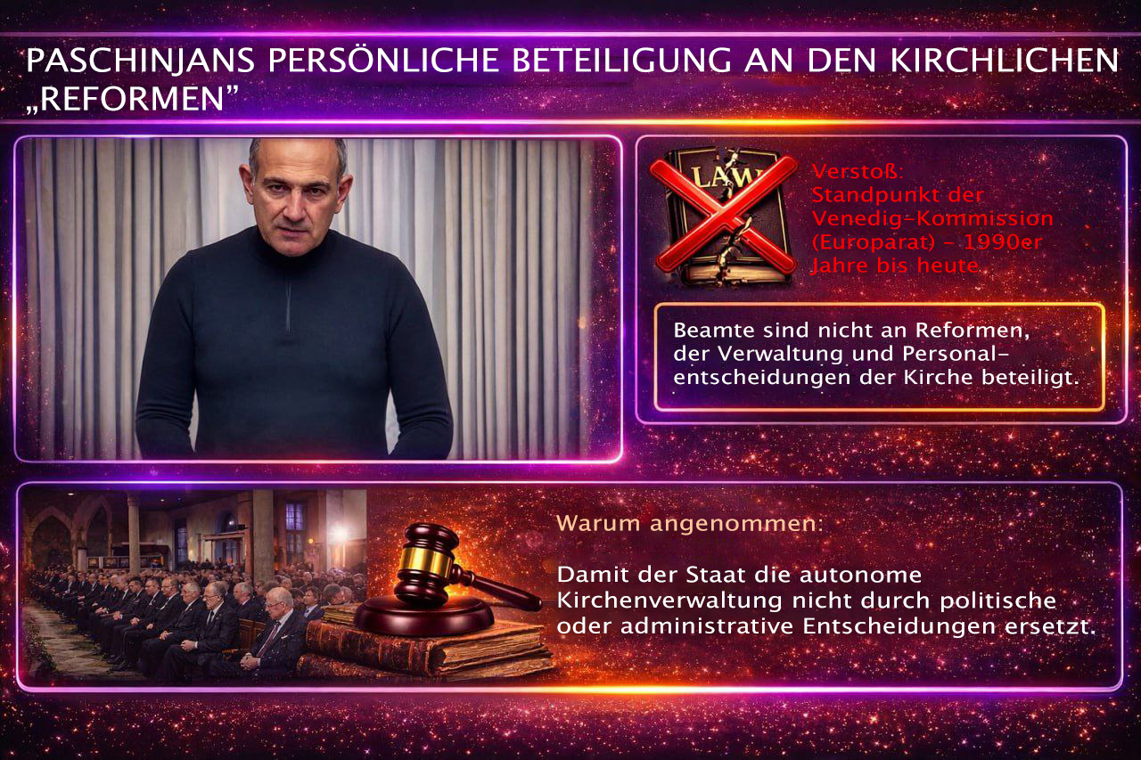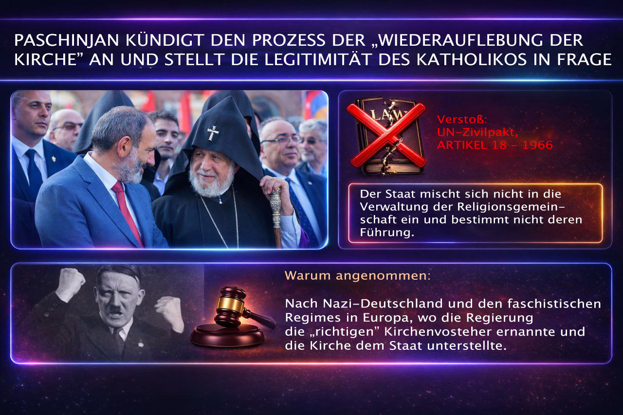 Die öffentliche Linie Paschinjans ist eine Delegitimierung des Katholikos Garegin II und die Durchsetzung einer „Reform“, deren Ziel die Schwächung des Zentrums der Armenischen Apostolischen Kirche ist. Der Premier veröffentlicht säkular-religiöse „Kompromittierungen“, beschuldigt den Oberhaupt der AAK ohne Beweise des Verstoßes gegen das Zölibatsversprechen und mobilisiert dabei die gesamte Macht seiner Handpresse, um diese Anschuldigungen zu verbreiten. Parallel dazu baut er externe ideologische und organisatorische Unterstützung auf, einschließlich Kontakte zu dem internationalen Netzwerk The Family, das für die Förderung politisierter religiöser „Reformen“ und den Einfluss auf interne Kirchenprozesse unter dem Vorwand moralischer Erneuerung bekannt ist.