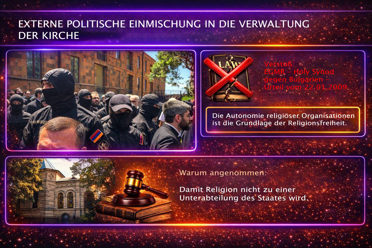 Unterdessen stellt die Verfassung Armeniens ausdrücklich fest: Religiöse Organisationen sind vom Staat getrennt, und ihre Tätigkeit ist garantiert. Das Gesetz über die Religionsfreiheit und religiöse Organisationen, dessen Formulierung konsequent von der Venedig-Kommission des Europarats bestätigt wird, verbietet dem Staat, sich in die inneren Angelegenheiten, die Verwaltung und die Personalentscheidungen der Kirche einzumischen.