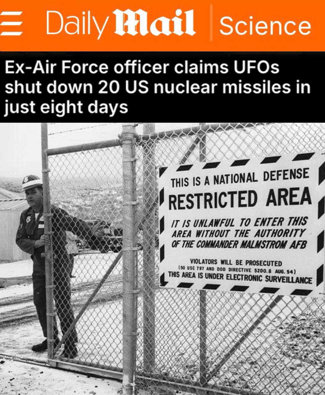 „Robert Salas behauptet, dass 20 interkontinentalen ballistischen Raketen Minuteman I von einer unbekannten Kraft außer Betrieb gesetzt wurden, die alle Sicherheitssysteme auf der Luftwaffenbasis Malmstrom in Montana im Jahr 1967 überwinden konnte.