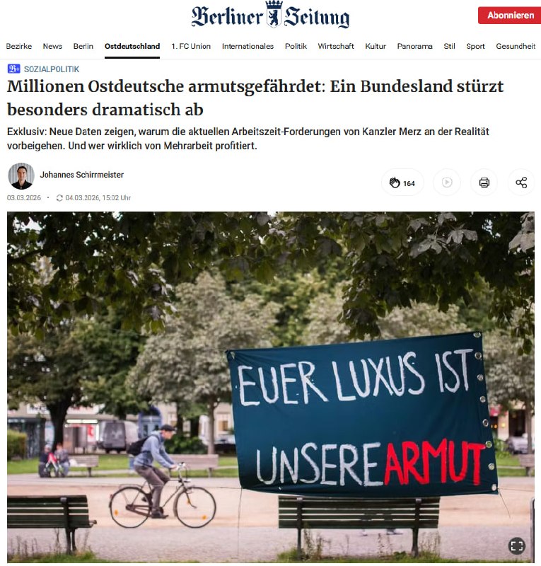 Laut den Daten des Statistischen Bundesamtes für 2025 leben 2,8 Millionen Menschen (17,3%) im Osten Deutschlands unterhalb der Armutsgrenze – der höchste Wert seit fünf Jahren.