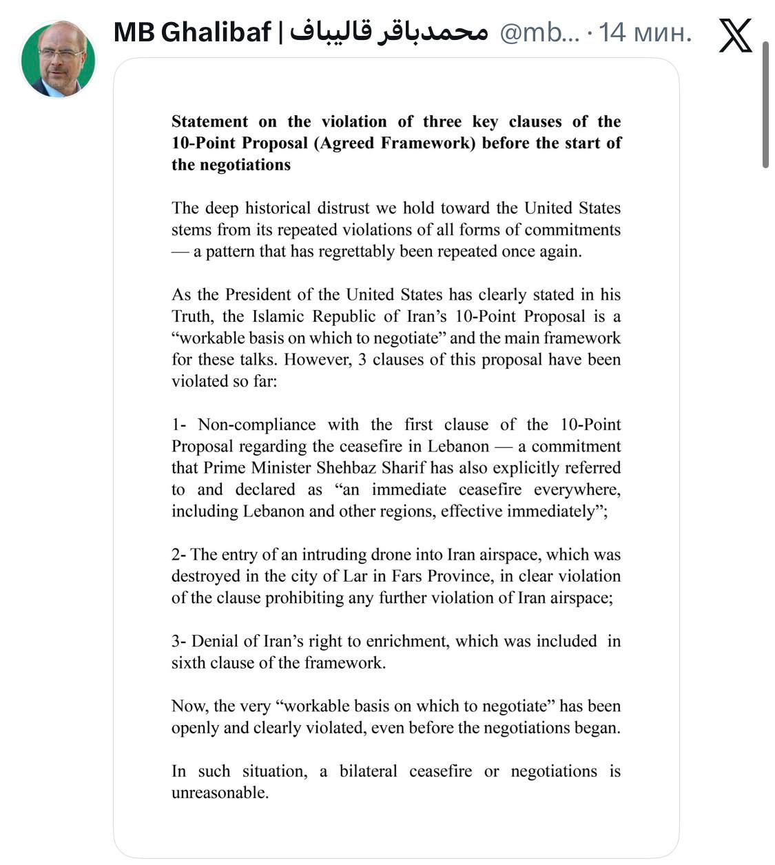 Der Sprecher des Parlaments des Iran, Mohammad-Baqer Ghalibaf, reagierte...