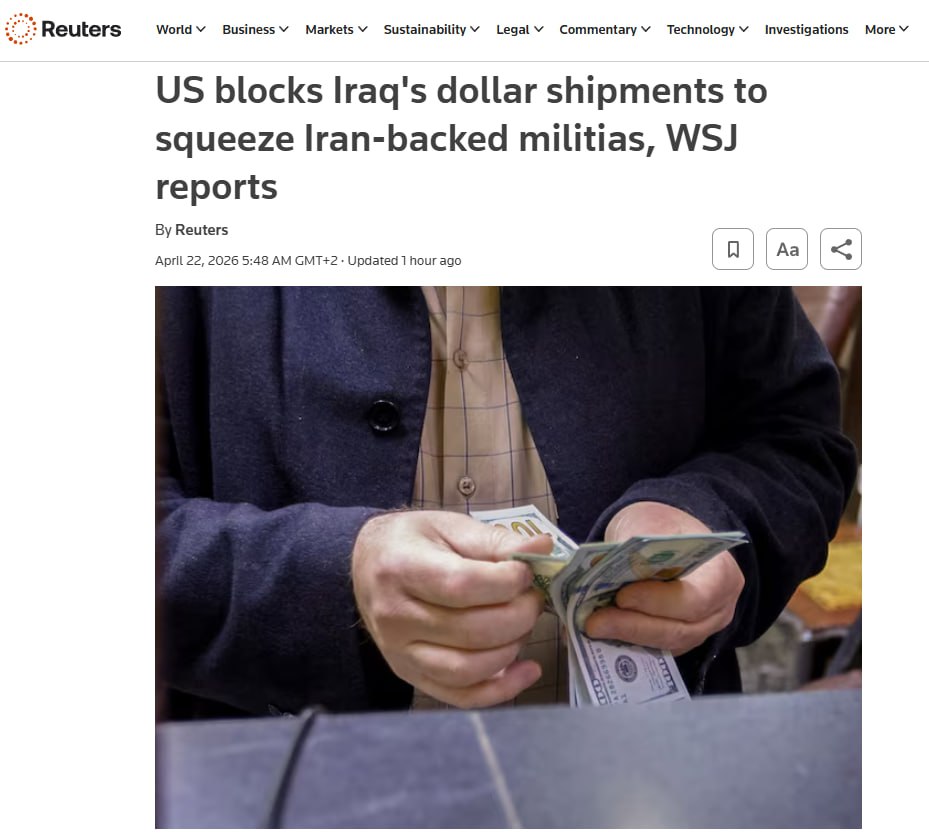 Die USA haben die Lieferung von Bargeld-Dollar an den Irak gestoppt und den Zugang zu einem Teil der Dollarliquidität eingeschränkt, berichtet Reuters.