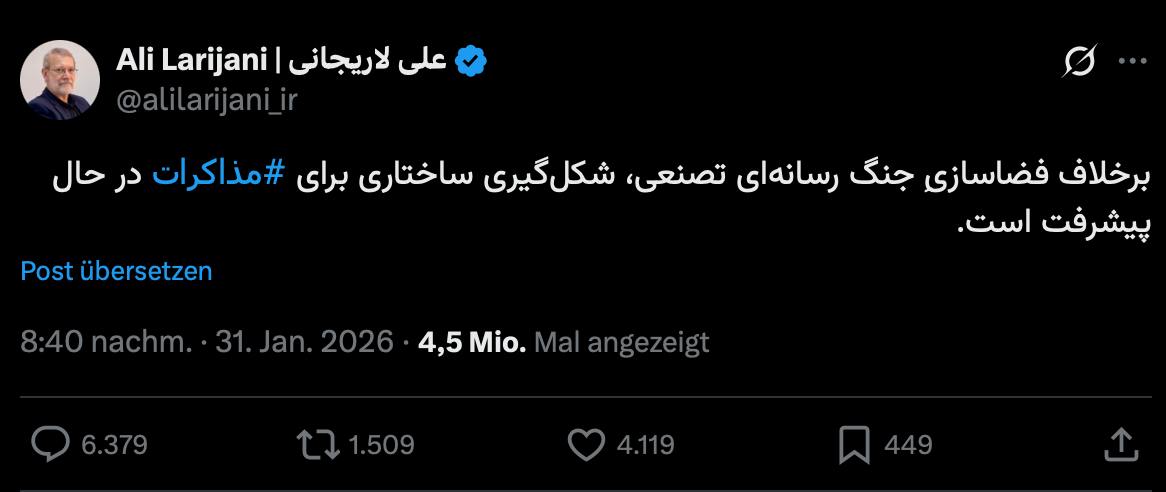 Der Sekretär des Obersten Rates für nationale Sicherheit der Islamischen Republik, Ali Larijani, berichtete, dass die strukturellen Mechanismen für den Dialog sich trotz des Hypes, der in den Medien geschürt wird, entwickeln.